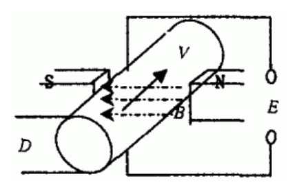 根據(jù)法拉第電磁感應(yīng)的定律,就是導(dǎo)電液體在磁場(chǎng)中切割磁力線運(yùn)動(dòng)時(shí),導(dǎo)體中產(chǎn)生的感應(yīng)電勢(shì)(見(jiàn)圖1),其感應(yīng)電勢(shì)的大小和磁感應(yīng)強(qiáng)度、流體做切割磁力線強(qiáng)度等一系列因素成正比。